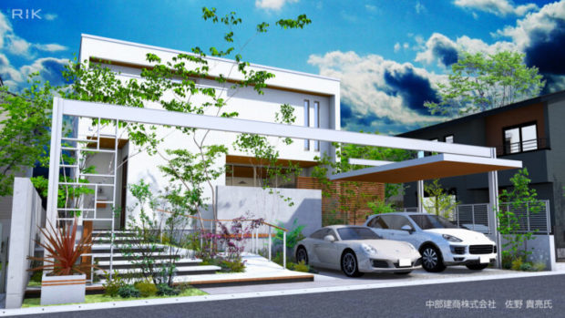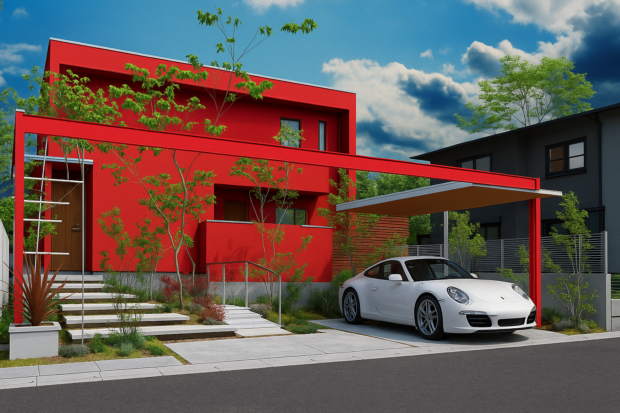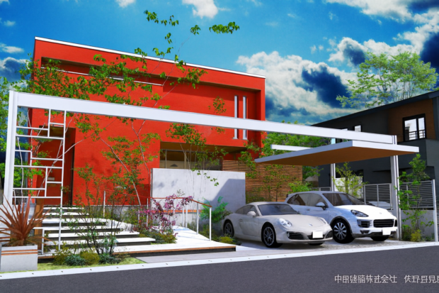 左側:建物の外壁を赤に 右側:車を一台に(なぜか白のはしらの部部が赤になってしまいました。)